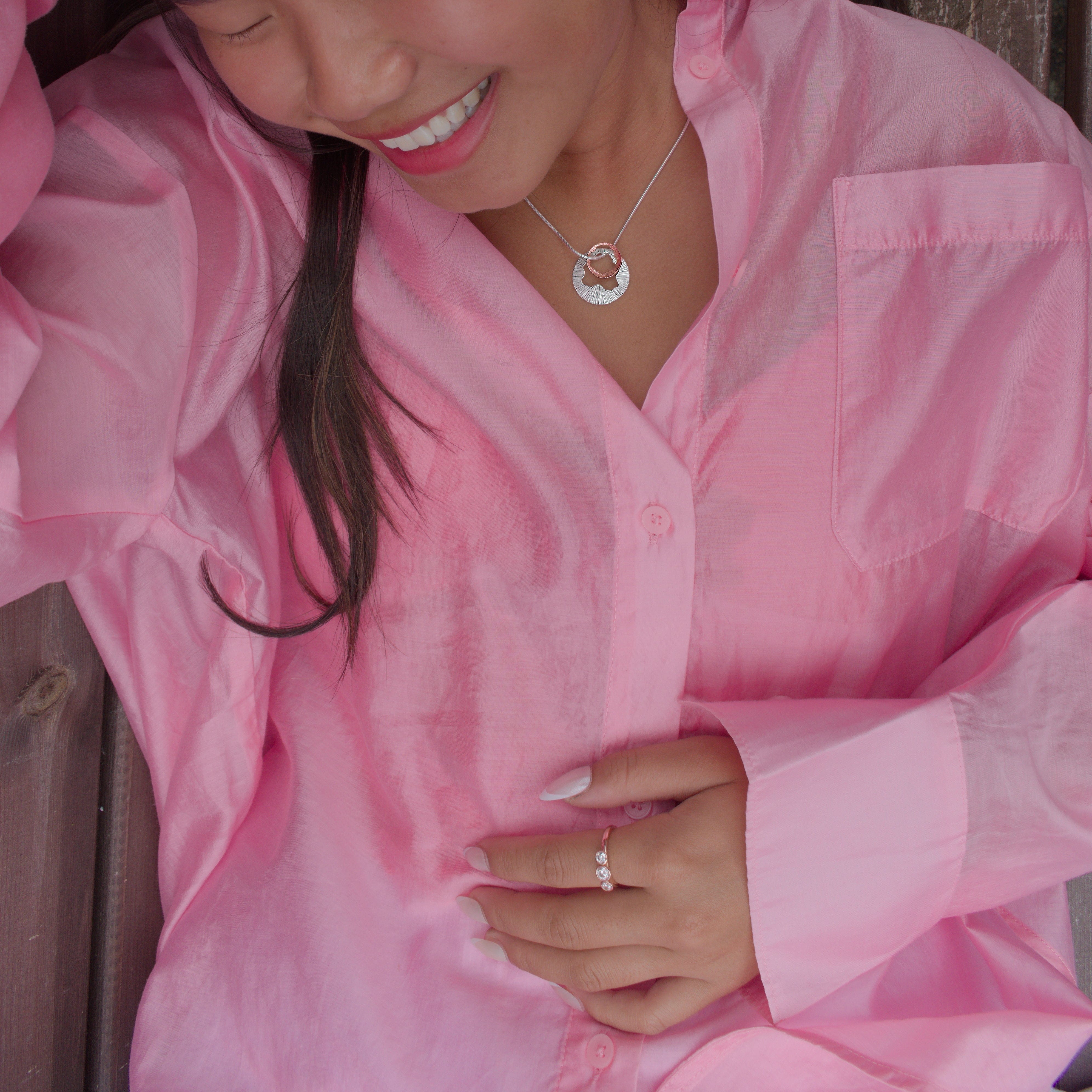 2 piece contemporary pendant. Handmade in hallmarked sterling silver and 10 carat rose gold.