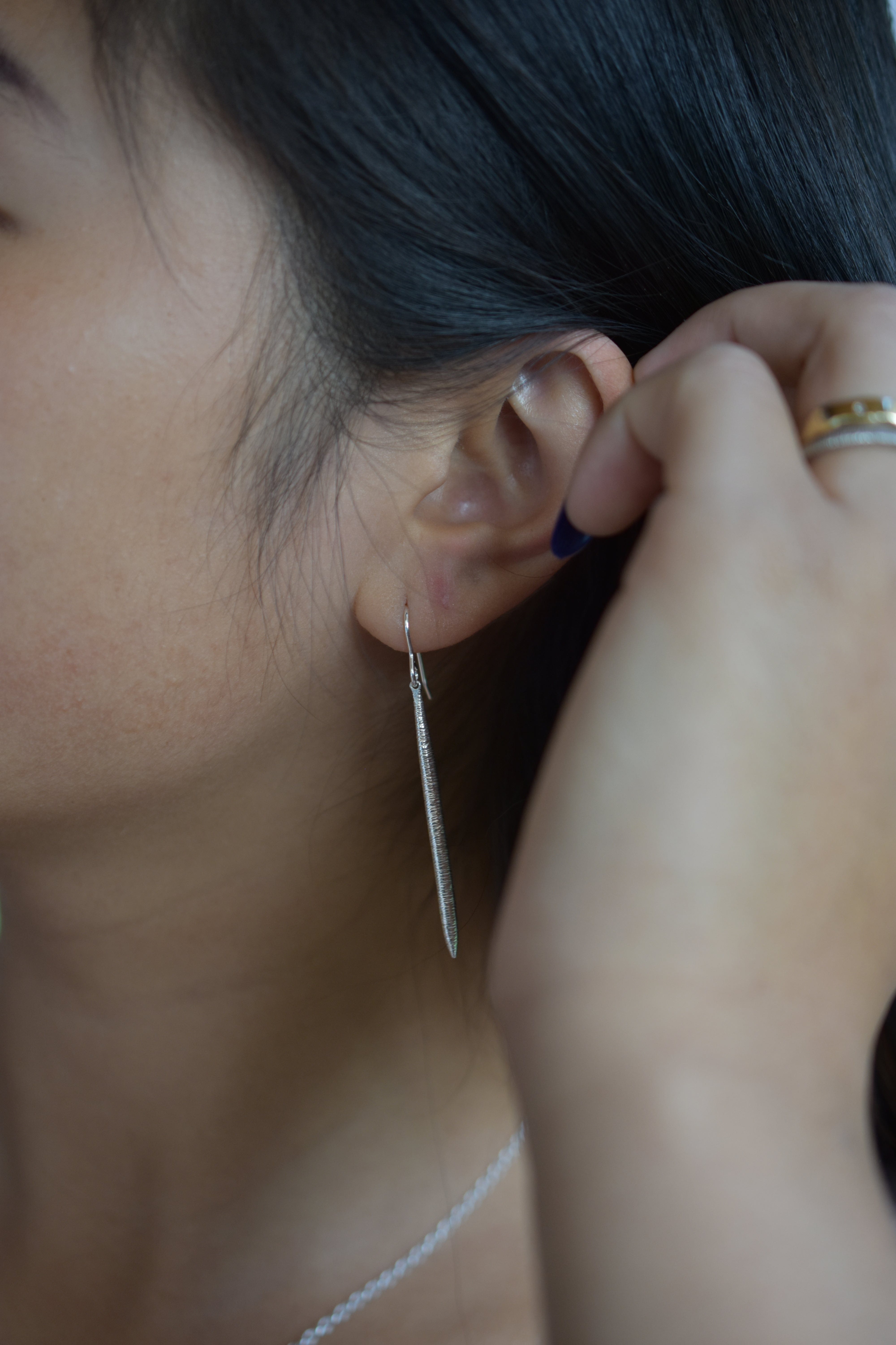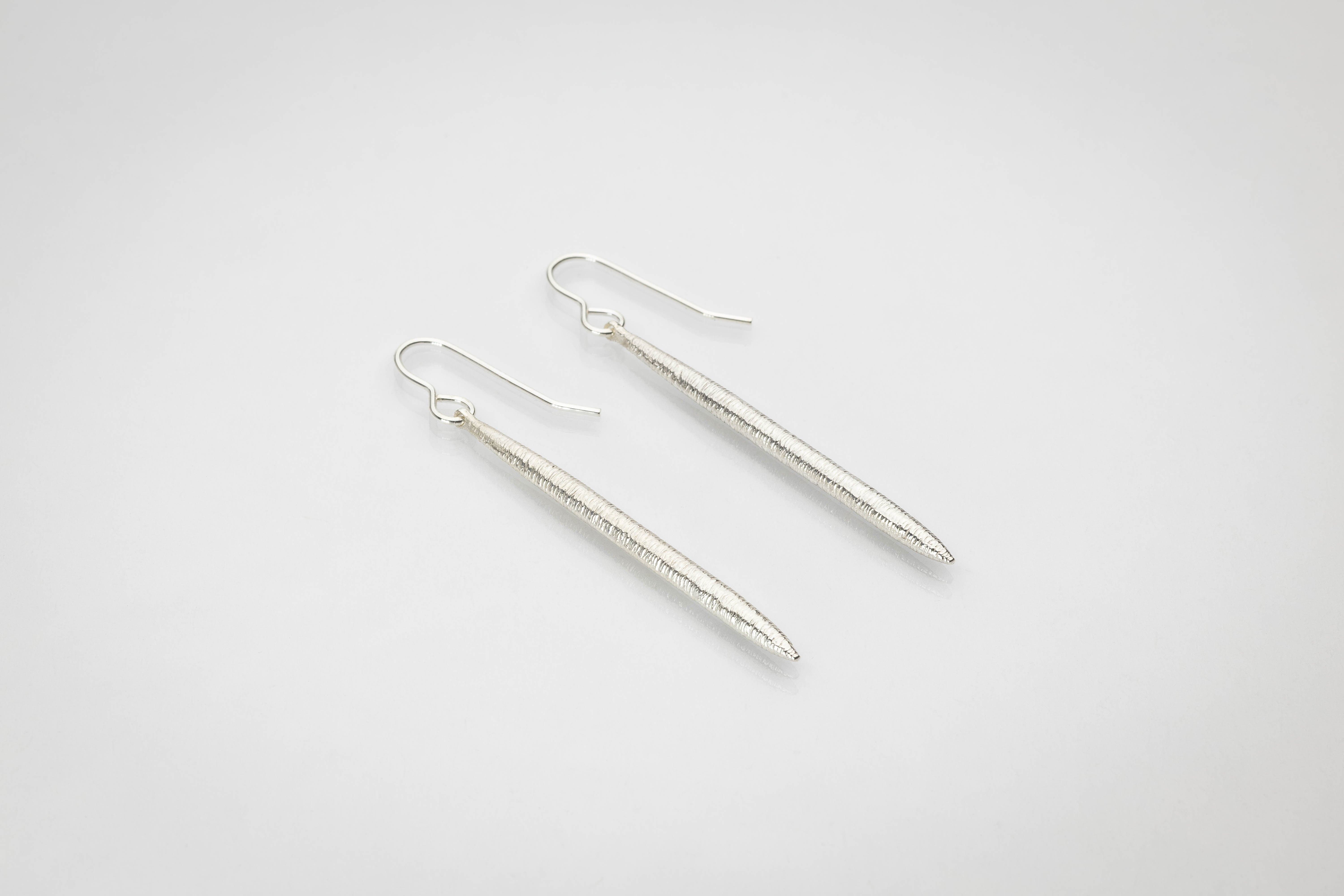 These large drop earrings feature gracefully sculpted forms that echo the spindle-like shapes and torc-inspired lines of the Síoda Collection. Their gentle movement enhances the play of light and shadow across the polished textured, offering a subtle, sophisticated shimmer next to the skin.