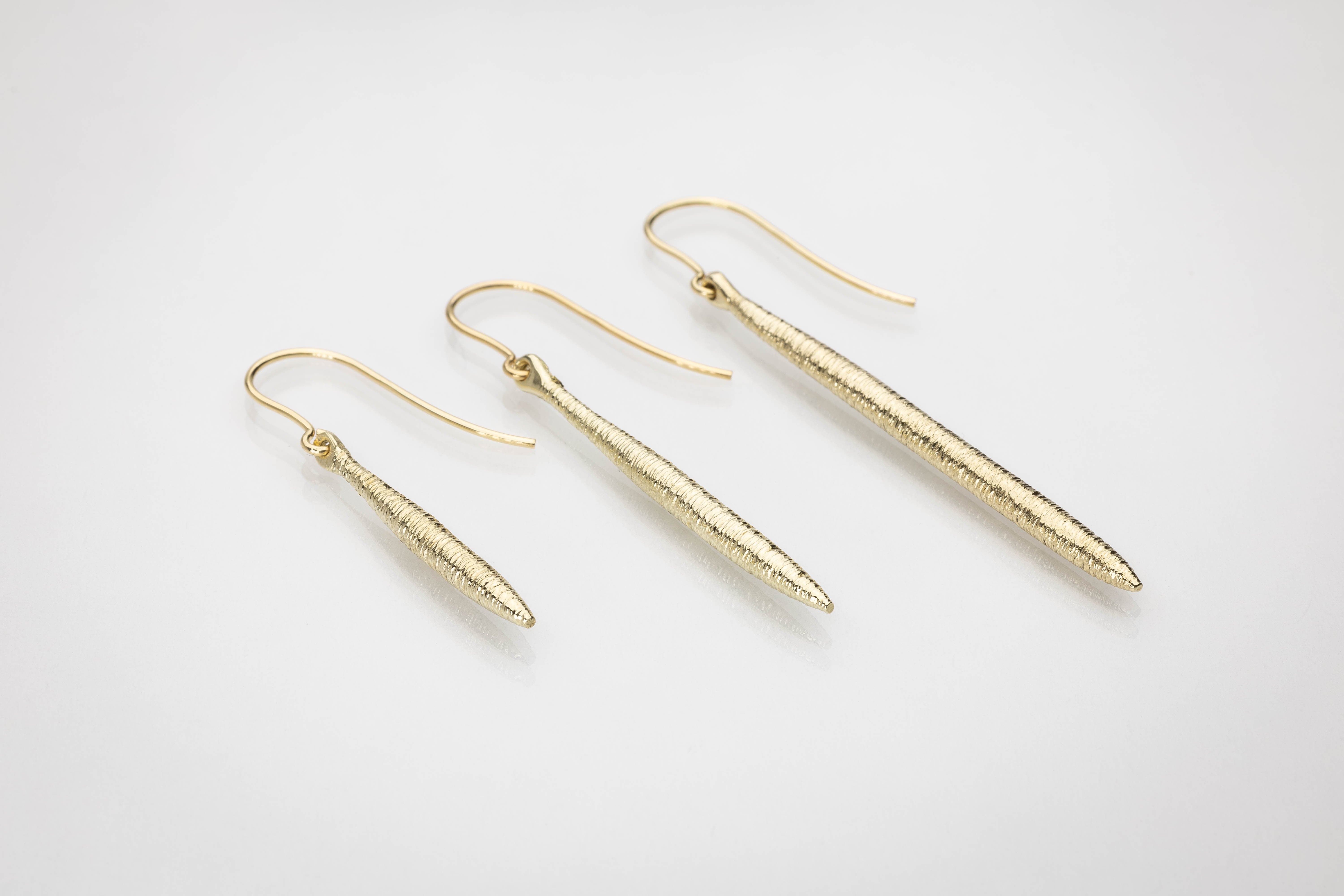 These large drop earrings feature gracefully sculpted forms that echo the spindle-like shapes and torc-inspired lines of the Síoda Collection. Their gentle movement enhances the play of light and shadow across the textured surfaces, offering a subtle, sophisticated shimmer next to the skin.