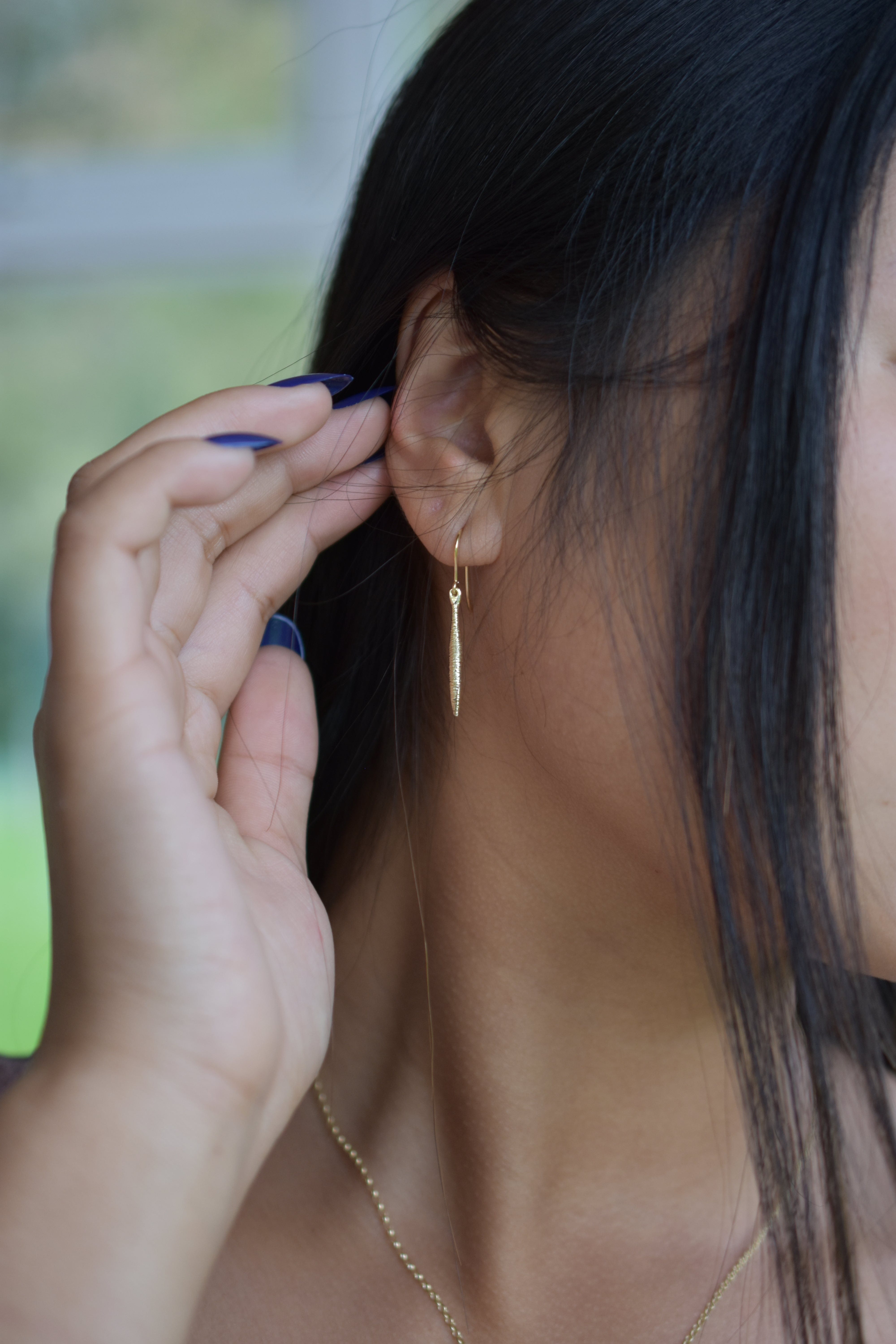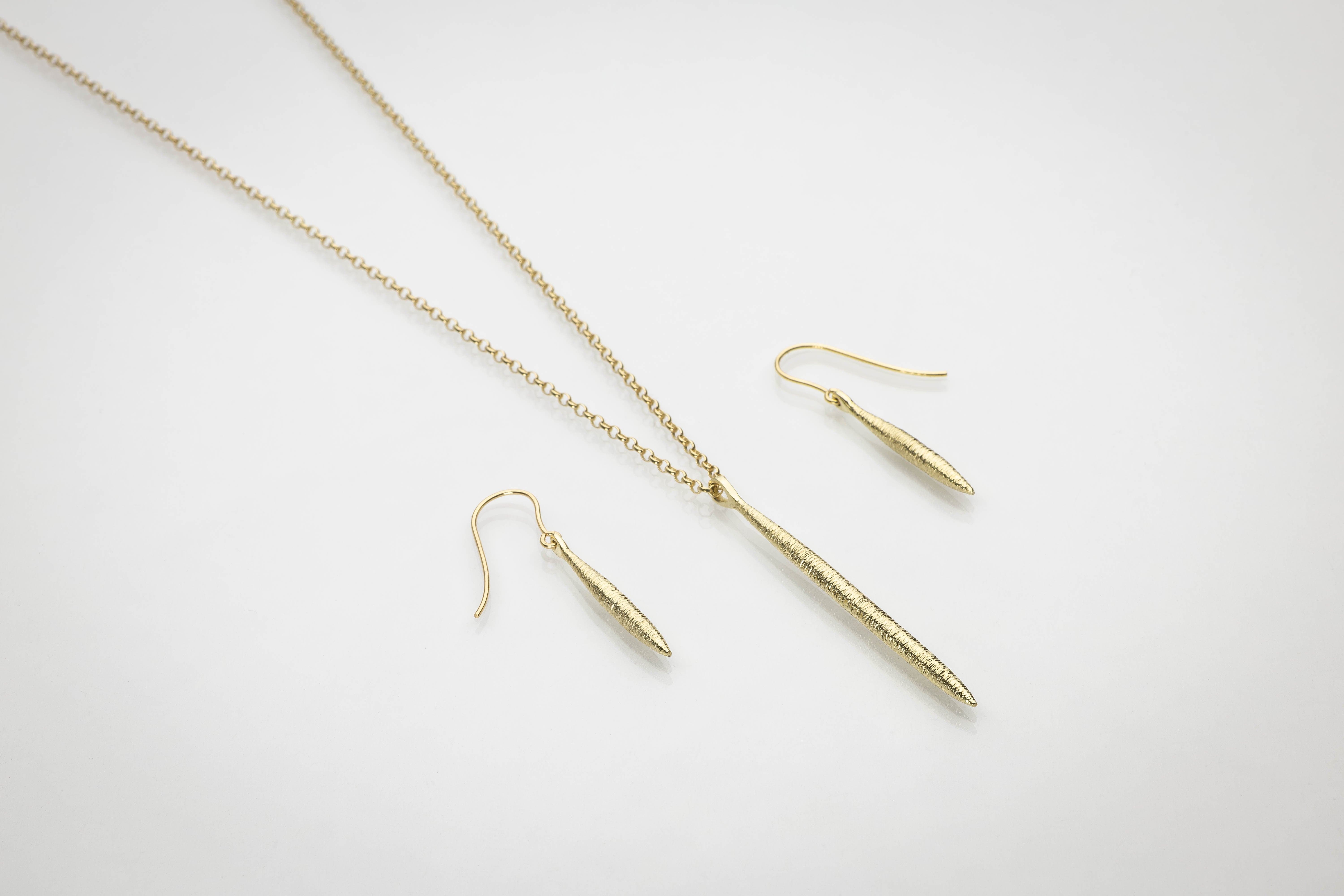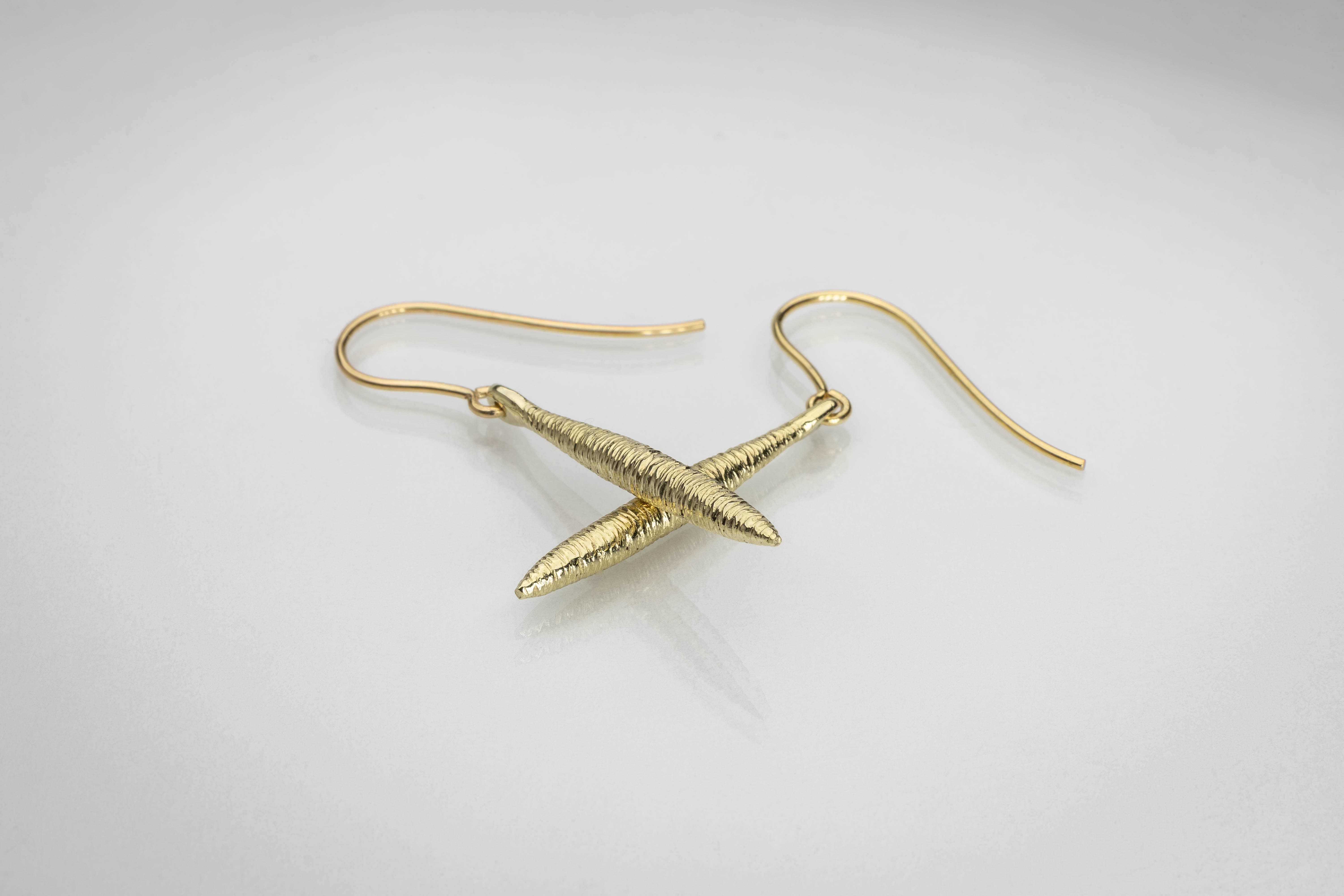 These small drop earrings feature gracefully sculpted forms that echo the spindle-like shapes and torc-inspired lines of the Síoda Collection. Their gentle movement enhances the play of light and shadow across the textured surfaces, offering a subtle, sophisticated shimmer next to the skin.