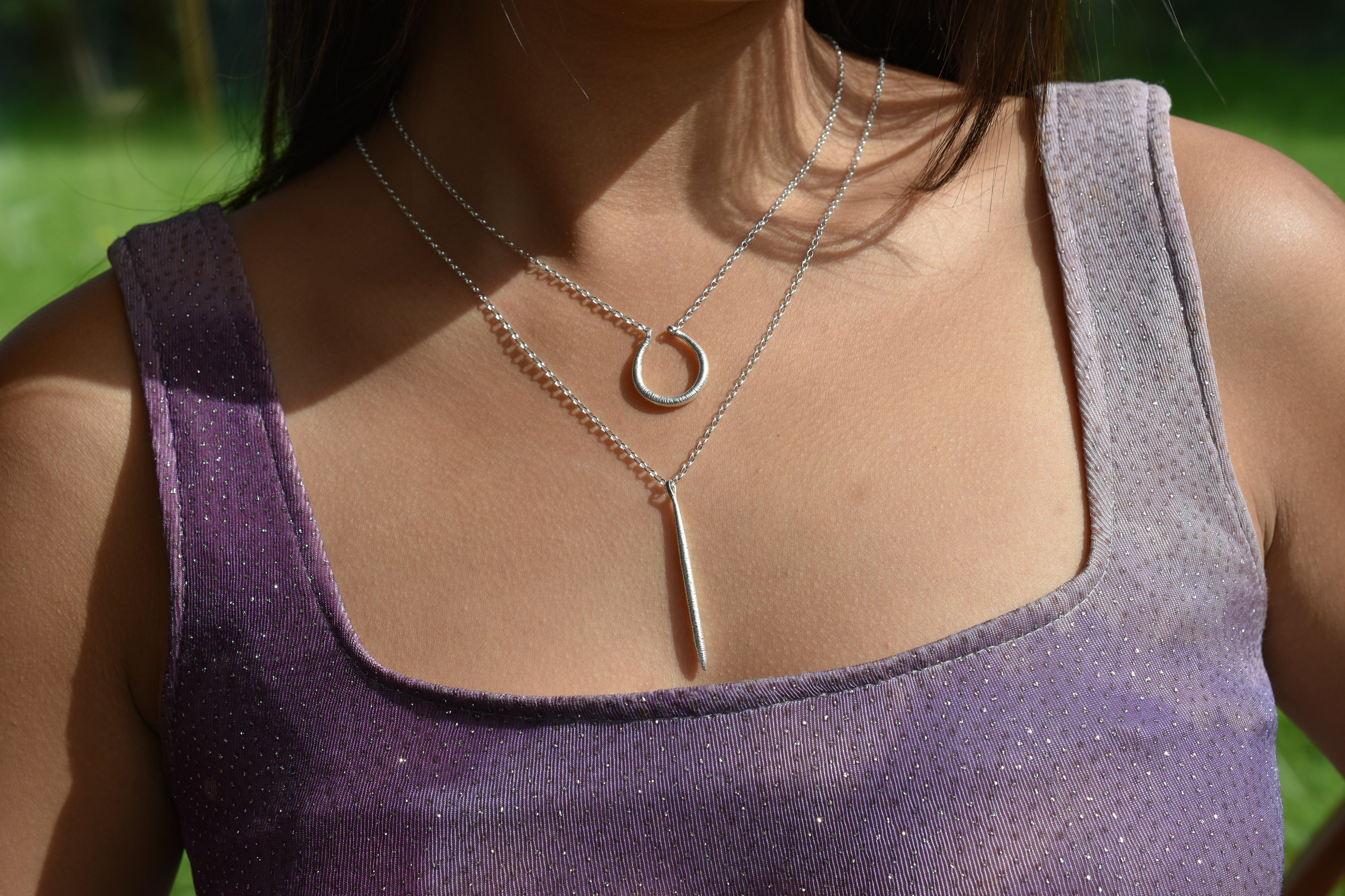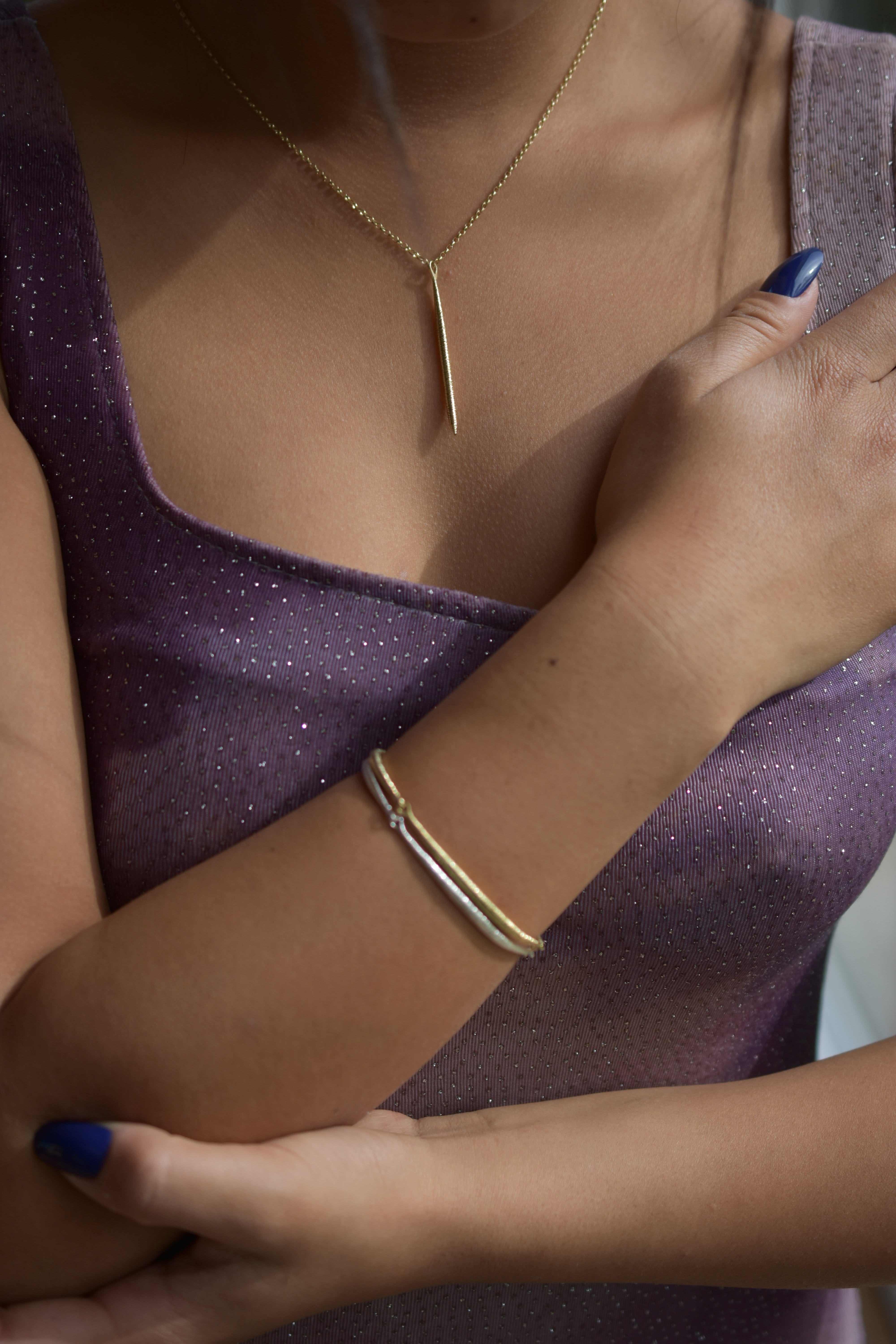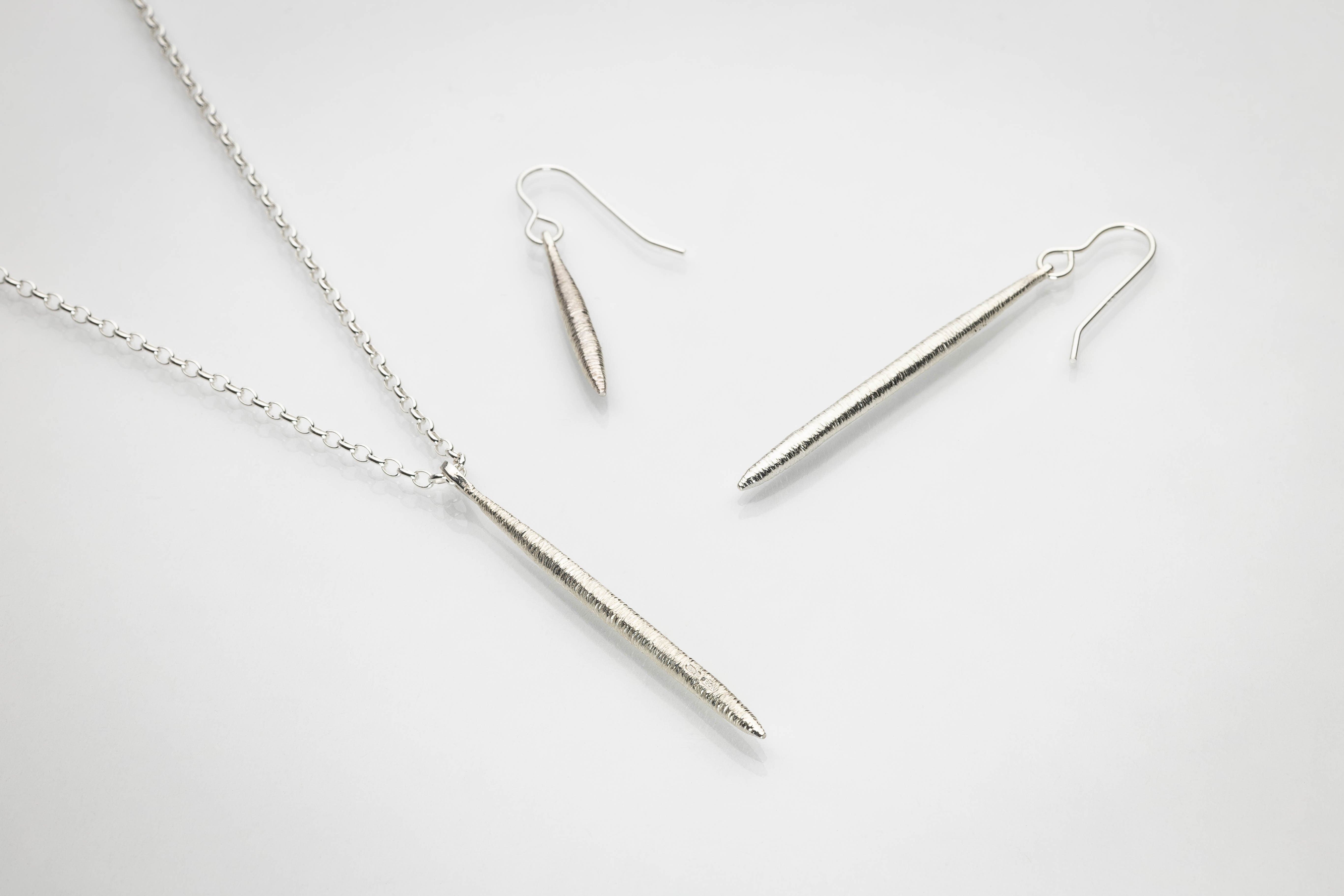 This long pendant features sculpted, spindle-like forms that echo the torc-inspired lines central to the Síoda Collection. Its textured surface catches the light beautifully, offering a subtle, sophisticated gleam that highlights both craftsmanship and design.
